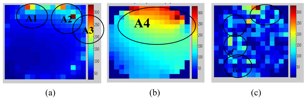 In Figure 13(a), the image reconstructed using the LBP method shows that the high concentration values of the image are not focusing on the area shown by the image captured by the CCD camera [as shown in Figure 12(c)]. Besides, it focuses around the sensor located near the real image labeled as A1, A2 and A3. It means that LBP method is not suitable for reconstructing the image for electrical charge tomography because of its non-linearity to the sensing mechanism.