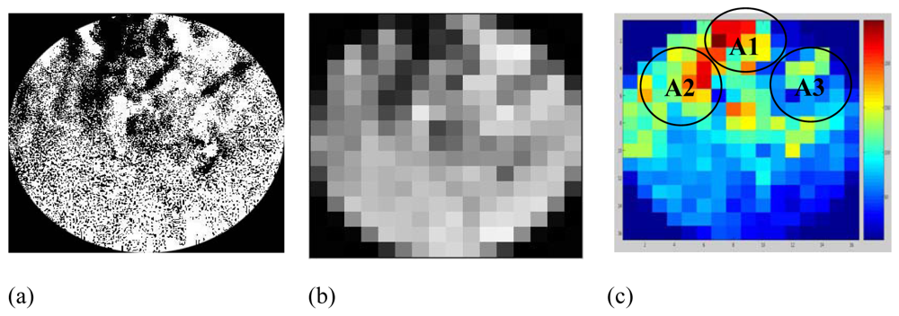 From the experiments conducted using the apparatus shown in Figure 5, several images had been captured to verify images from LBP, FBP and LSR image reconstruction algorithm. Figure 12 shows the image captured by the CCD Camera with three different modes. Figure 12(a) shows the original image after identification of the sensing area for material flow in the pipeline. Figure 12(b) is the image of Figure 12(a) after being resized to a 16 by 16 matrix with gray color and Figure 12(c) is the image of Figure 12(b) after being converted to color mode-using MATLAB.