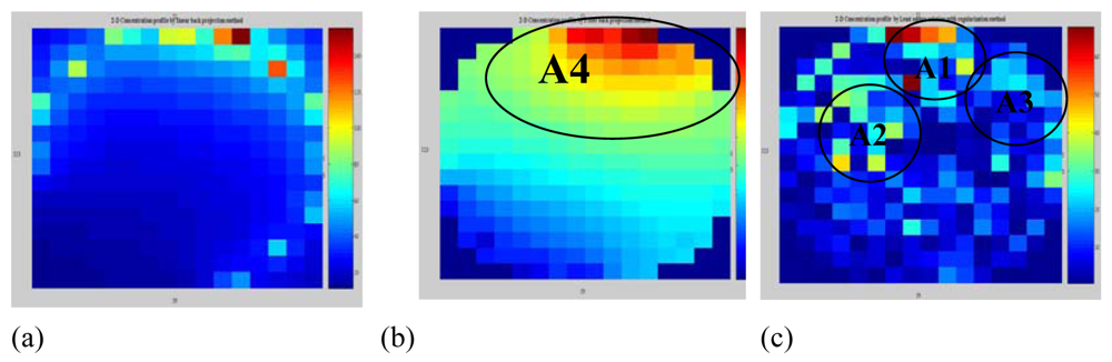 Figure 13(b) shows that the image reconstructed using the FBP method is accurate in detecting the high concentration area labeled as A4. However, there is a larger point image compared to the one in Figure 12(c). Another problem with FBP is that a high concentration exists near the sensor which reduces the value away toward the centre. As a result, two or many charges in the sensing area cannot be differentiated by FBP.
