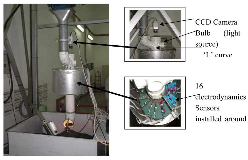 The CCD camera will be used to capture the video of material flow in the pipeline. Data from electrodynamics sensors are captured using the data acquisition card and stored in the computer. The image reconstruction process is done off-line using the MATLAB programming language. Data from the CCD camera were processed using digital image processing to produce a single image concentration profile for the material being dropped in the pipeline.