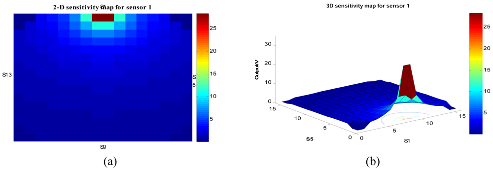 Sensitivity map for sensor 1 (a) Two dimensional (b) Three dimensional.