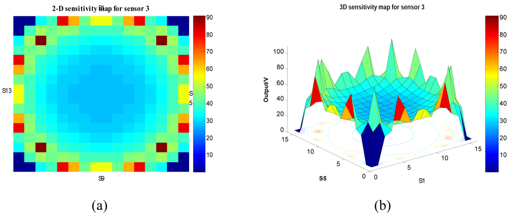 The sensitivity map for the rest of the sensors is calculated using the same equation, but with some changes on the coordinates depending on the sensor coordinates, as shown in Figure 6. The summation of the complete sensitivity map, S, for sixteen sensors in two and three-dimensions is shown in Figure 8.