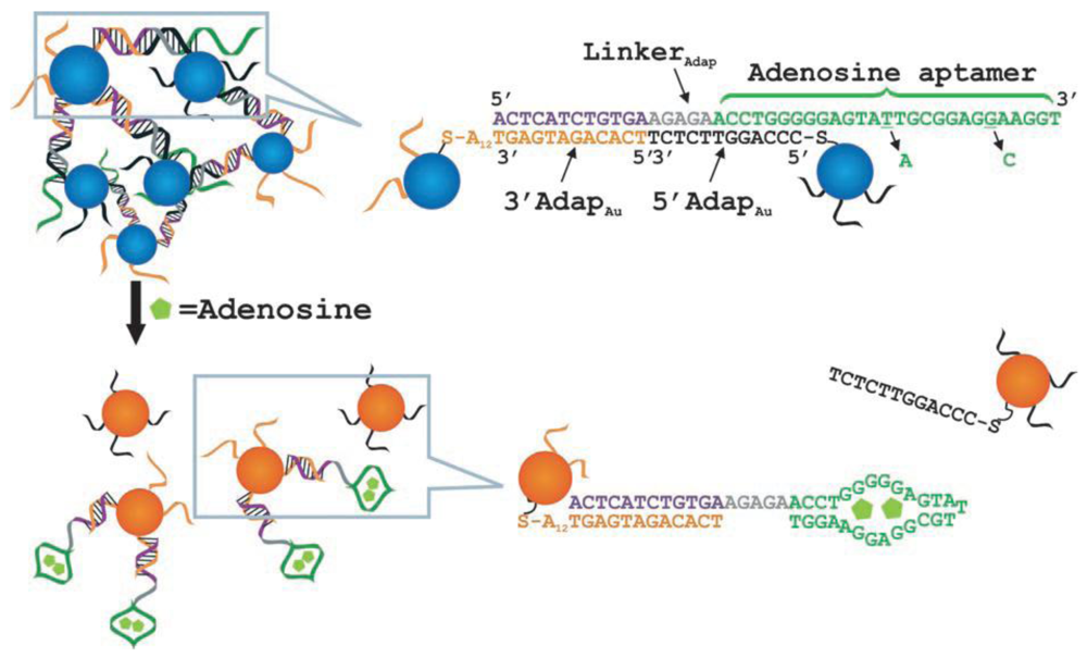 Schematic representation of colorimetric detection of adenosine. The DNA sequences are shown in the right side of the figure. The A12 in 3′AdapAu denotes a 12-mer polyadenine chain. In a control experiment, a mutated linker with the two mutations shown by the two short black arrows was used. Reprinted with permission from Reference [].