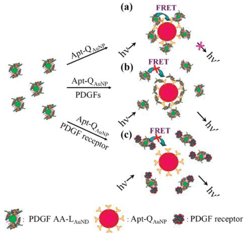 Schematic representations of PFGF and PDGF-receptor nanosensors that operate based on the modulation of the photoluminescence quenching between PDGF AA-Au NP and Apt-Au NP. h: Planck's constant; ν: frequency of light. Reprinted with permission from Reference [].