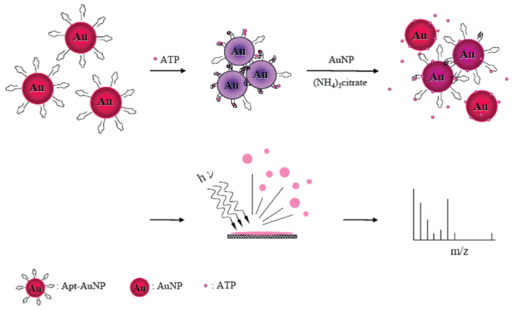 Recently, NPs have become interesting materials for mass spectrometry, mainly because they can act as probe to recognize targeted molecules and as matrices like the organic molecules used in matrix assisted laser desorption mass spectrometry (MALDI-MS) to assist desorption/ionization of the analytes. Most common NPs used in mass spectrometry are Au NPs, TiO2 NPs, and Fe3O4 NPs []. Using aptamer-modified 13-nm Au NPs as selective probes and unmodified Au NPs as the surface-assisted laser desorption/ionization (SALDI) matrices for the determination of ATP by mass spectrometry was demonstrated by Huang et al. []. Figure 2 describes the strategy of the two-step sample preparation for analysis of ATP by SALDI mass spectrometry (SALDI-MS) using Apt-Au NPs are effective LDI matrices. A thiol-modified ATP-binding aptamer that has a specific affinity (Kd∼6 μM) with ATP was introduced to Au NPs. The ATP-binding aptamer was covalently attached to the surfaces of Au NPs through Au-S bonding. By using Apt-Au NPs as selective probes and Au NPs as LDI matrices, this approach provided the LOD for ATP at a signal-to-noise ratio of 3 of 0.48 μM. Because Au NPs and Apt-Au NPs provided high selectivity toward glutathione and ATP, respectively, they were also used for the analysis of the two analytes in lysates of human red blood cells after simple sample pretreatment. The estimated concentration of ATP and glutathione in the cell lysate were 1.9 ± 0.3 and 0.94 ± 0.06 mM (n = 3), respectively.