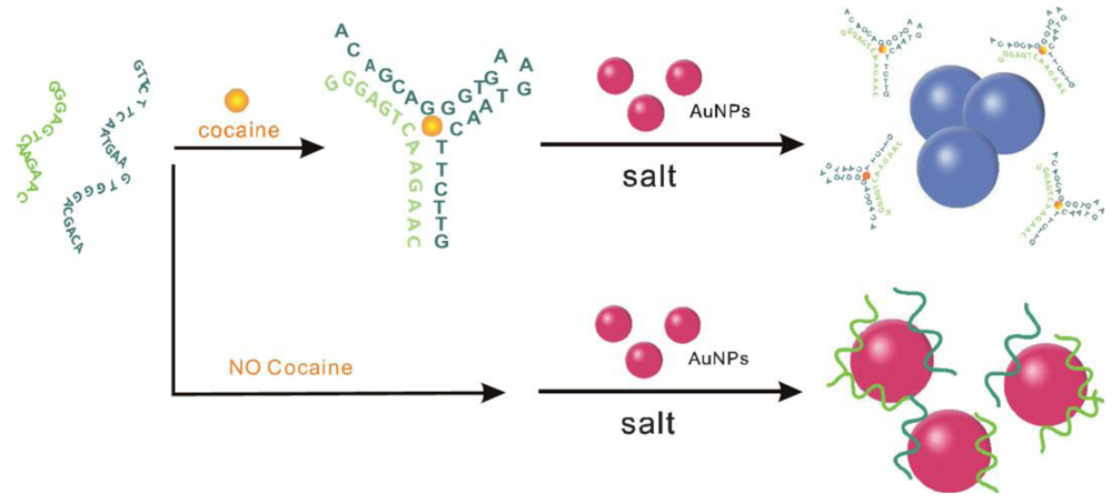 Scheme for the engineered cocaine aptamer and the visual detection of cocaine based on the red-to-blue color change of Au NPs. Reprinted with permission from Reference [].