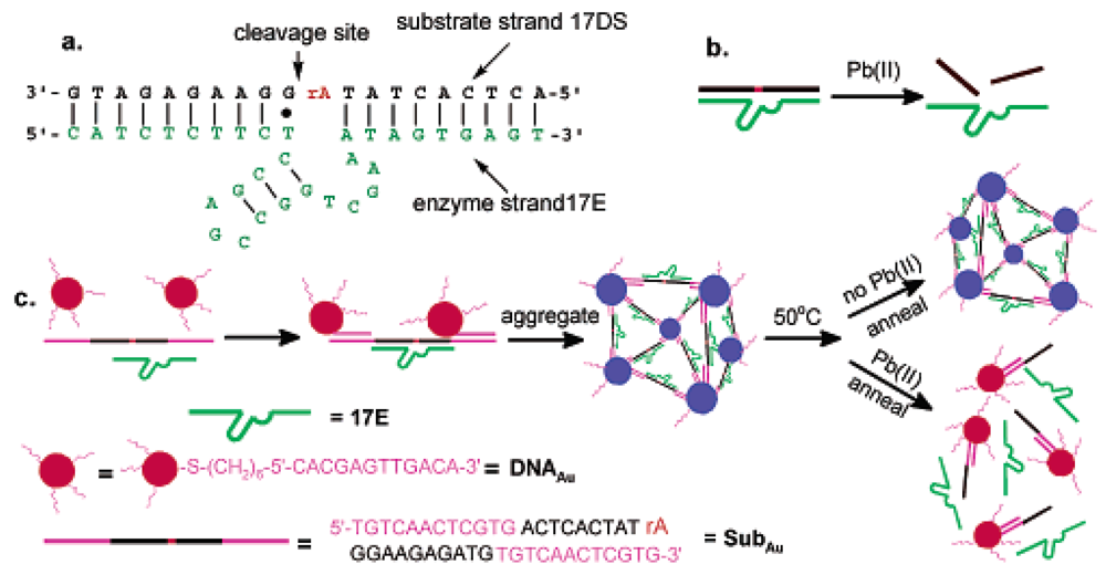 (a) Secondary structure of the “8-17” DNAzyme system that consists of an enzyme strand (17E) and a substrate strand (17DS). The cleavage site is indicated by a black arrow. Except for a ribonucleoside adenosine at the cleavage site (rA), all other nucleosides are deoxyribonucleosides. (b) Cleavage of 17DS by 17E in the presence of Pb2+. (c) Schematics of DNAzyme-directed assembly of Au NPs and their application as biosensors for metal ions such as Pb2+. In this system, the 17DS has been extended on both the 3′ and 5′ ends for 12 bases, which are complementary to the 12-mer DNA attached to the 13-nm gold nanoparticles (DNAAu). Reprinted with permission from Reference [].