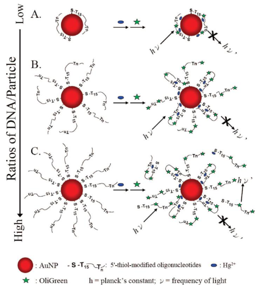 Schematic representation of Hg2+ nanosensors at various DNA-to-Au NP molar ratios: (a) <30, (b) 30–50, and (c) ≥60. Reprinted with permission from Ref. [].