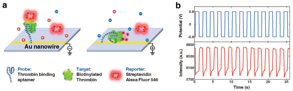 An electrically modulated fluorescence assay was demonstrated for thrombin through a single molecule assembled on an Au nanowire (Au NW) by manipulating the molecule with an electrical potential applied on the nanowire []. The scheme of probe-target-reporter sandwich assay is shown in Figure 7. Biotinylated thrombin was captured by aptamer assembled Au NW and then labeled by a fluorescent streptavidin reporter. By applying an alternating electrical potential on the Au NW, the probe-target-reporter complex was attracted toward or repelled from the Au NW, which modulated its fluorescence accordingly due to the surface energy transfer between the fluorescence reporter and NW. It was demonstrated that the molecular modality could be unequivocally correlated with the modulated fluorescence, which enabled the specific fluorescence from a single thrombin molecule to be unambiguously distinguished from background noise and nonspecific fluorescence. The LOD of the assay for thrombin in buffer solution was 100 fM, and the linear dynamic range of the assay could extend from 100 fM to 100 nM.
