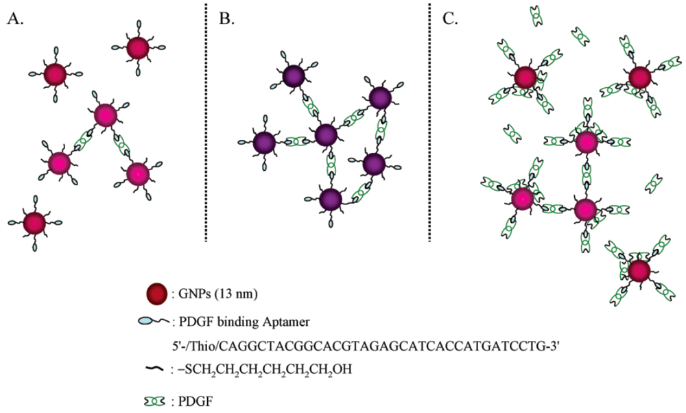 Schematic representation of the aggregation of Apt-Au NPs in the presence of PDGFs at (a) low, (b) medium, and (c) high concentrations. Reprinted with permission from Reference [].