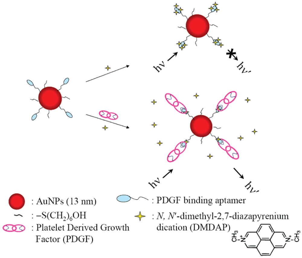 An Apt-Au NP based molecular light switching sensor was prepared for the analysis of PDGFs and their receptors in homogeneous solutions []. The PDGF binding aptamer has a unique structure with triple-helix conformation that allows N,N-dimethyl-2,7-diazapyrenium dication (DMDAP) and PDGF bindings (Figure 9).