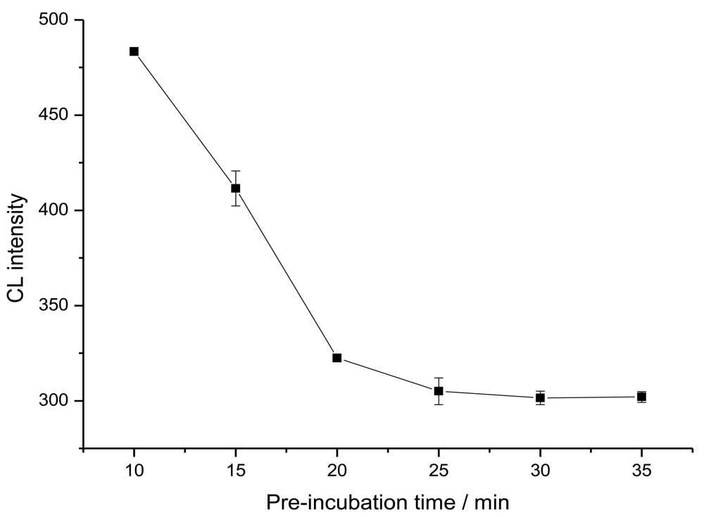 The determination of CEA was based on the non-competitive immunoassay. A phosphate buffer solution (PBS, 0.1 M, pH 7.0) was used as the carrier. Ninety μL of HRP-labeled anti-CEA and 10 μL of CEA standard solution were mixed and loaded on the immunoaffinity column at a flow rate of 0.05 mL/min, followed washing with PBST (pH 7.0, containing 0.05% Triton X-100) to remove the unreacted HRP-labeled anti-AFP and physically adsorbed enzyme. Then luminol, PIP and H2O2 were mixed and delivered to the column with the aid of the valve; the CL signal was detected. To optimize the pre-incubation time, 10 μL 0 ng/mL CEA was incubated with 90 μL HRP-labeled antibody at 37 °C, detected at different time intervals, as shown in Figure 2. At the pre-incubation time of 25 min, the CL intensity decreased to a minimum value, indicating a maximum combination of CEA with its enzyme tracer. Thus, a pre-incubation of 25 min was chosen for the present system.
