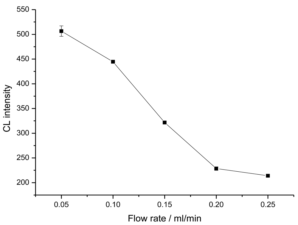 Effect of flow rate of pre-incubation immunomixture through the immunoaffinity column on the CL intensity. Pre-incubation time of 0 ng/mL CEA with enzyme tracer was 25 min