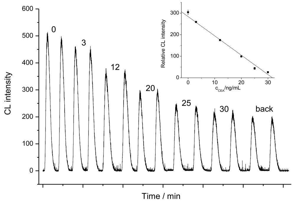 The CL intensity was decreased with the increasing CEA concentration as shown in Figure 4, showing a linear range of 3–30 ng/mL with a correlation coeffience of 0.998 (insert in Figure 4). The regression equation was I = 284.38 – 8.97c (ng/mL), where I is the relative CL intensity and c is the CEA concentration. When the CEA concentration was increased up to 30 ng/mL, an appropriate dilution of sample was needed in the pre-incubation step.
