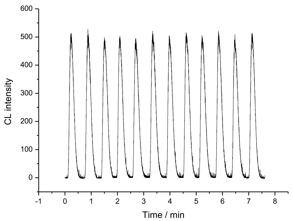 Reproducibility of the immunoaffinity reactor, 0.5 mM luminol + 4 mM H2O2 + 0.4 mM PIP at CEA concentration of 3 ng/mL.