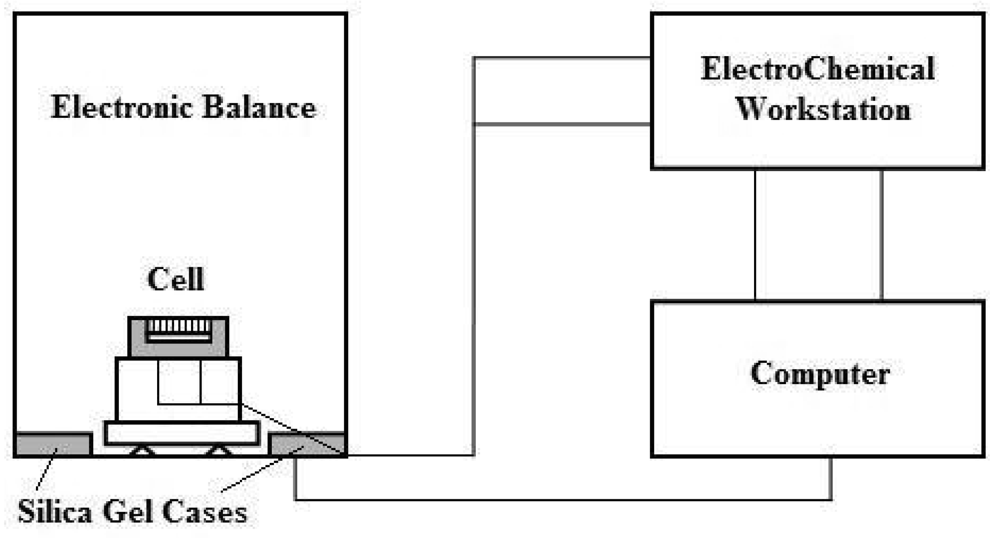 As shown in Figure 2, the cell was fixed in a PMMA pedestal, connected to the electrochemical workstation by wires that were welded on the plates, and then positioned on the stage of a high-precision electronic balance (Sartorius, 0.1 mg) for in situ weight measurement. The connecting wires were fixed tightly so that the weight monitoring process won't be affected. Desiccant (silica gel) cases were put in the four corners of the balance in order to maintain a relatively constant humidity inside the balance. During the wet-dry cycles, readings of the balance were automatically recorded every 30 s by software. The room temperature was kept at 25 °C.