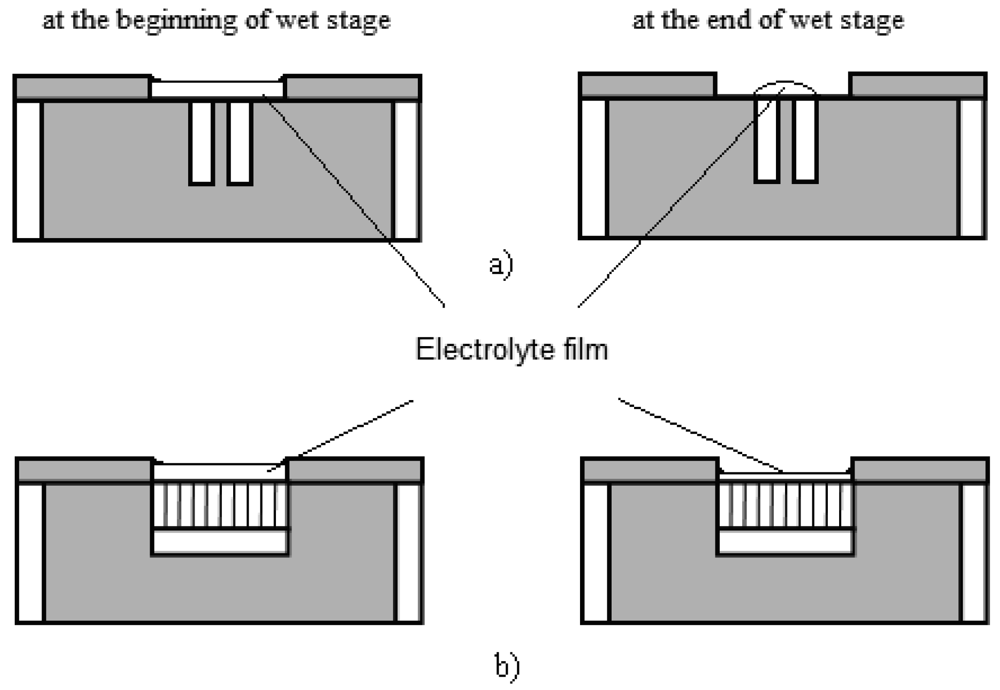 Electrodes used in electrochemical experiments are mostly chip-shaped, rod-shaped or square-shaped with small surface areas. The main difference between these electrodes and comb-shaped electrodes which were used in this experiment is the electrode area proportion, that is, the proportion of the area of electrode surface in the area covered by electrolyte film. Figures 3a,b illustrate the effect of different electrode area proportionss on the measurement of the electrolyte film thickness during wet-dry cycles. To avoid acutely uneven current distributing over the electrolyte film, the area of working surface (i.e., surface covered by electrolyte film) cannot be too small. Therefore, as is shown in Figure 3a, the electrode area proportion of normal chip electrodes is quite small []. However in this experiment, the accurate calculation of electrolyte thickness with Equation (2) demands a constant electrolyte film area. Due to the different wetting condition of water solution on metal and epoxy, the electrolyte film tends to shrink to metal surface and form an electrolyte drop instead of film at the end of a wet stage, which causes the area of the film to change continuously, especially when the critical wet/dry condition is reached.
