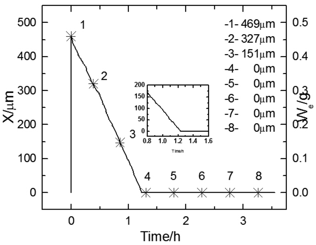 Figure 6 shows the change of electrolyte film thickness over time during the 50th wet-dry cycle. The curve is quite similar in shape with that of the 1st cycle, except that the slope of the curve shows a slight change when the curve goes near zero. This is because after the wet-dry cycles, a rust layer with remarkable thickness accumulated on the electrode surface, and hindered the evaporation of the electrolyte film.