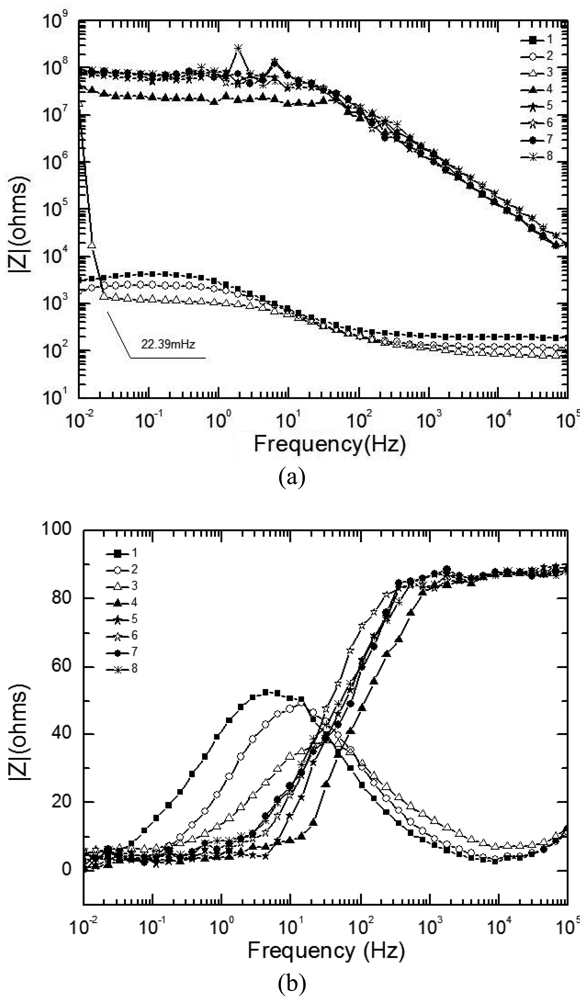 EIS results of 50th cycle: (a) Bode diagram (|Z|); (b)Bode diagram (Phase of Z).