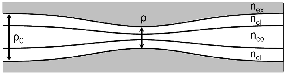 When a cladded optical fiber is tapered both the cladding and the core diameters are reduced in size. The schematic structure of a cladded taper is shown in Figure 1, where nco, ncl and nex are the refractive indices of the fiber core, cladding and external medium, respectively. ρ0 and ρ are the diameters of the uniform fiber and the taper waist, respectively. The taper ratio is defined as R = ρ/ρ0 and L is the length of the taper. Despite to the fact that taper core is not in direct contact with the external medium, cladded fiber tapers can be used for sensing applications [2,3]. In fact, in the down taper region, some of the high-order guided modes are no longer confined in the core region but can still be guided by the fiber in the cladding region. Therefore, in the taper region, there is an evanescent wave related to cladding modes bounded by the cladding-external medium interface [2,3] that can be used for probing the absorption properties of the surrounding medium. At the end of the taper, some of the cladding modes are coupled back into guided core modes by the up-taper, hence the transmitted intensity can be detected at the proximal end of the fiber.