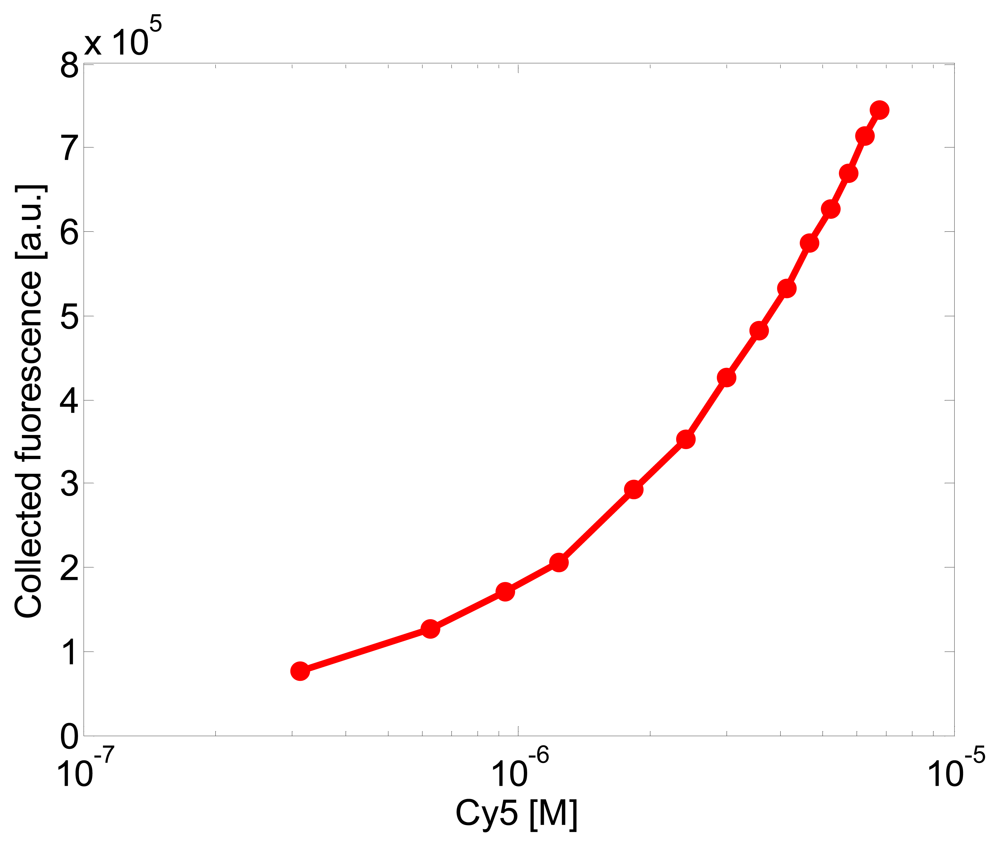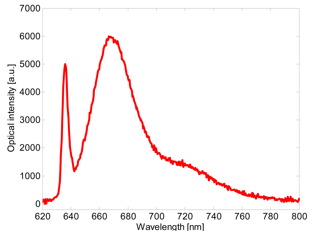 Figure 10 shows the collected spectra for a sample concentration of 6.76 × 10−6 M. The spectra of the collected fluorescence are given by the optical intensity for λ > 650 nm, whereas the narrow peak at 635 nm is the scattered contribution coming from the source. As can be observed, collected scattered excitation light is low compared to the fluorescence.