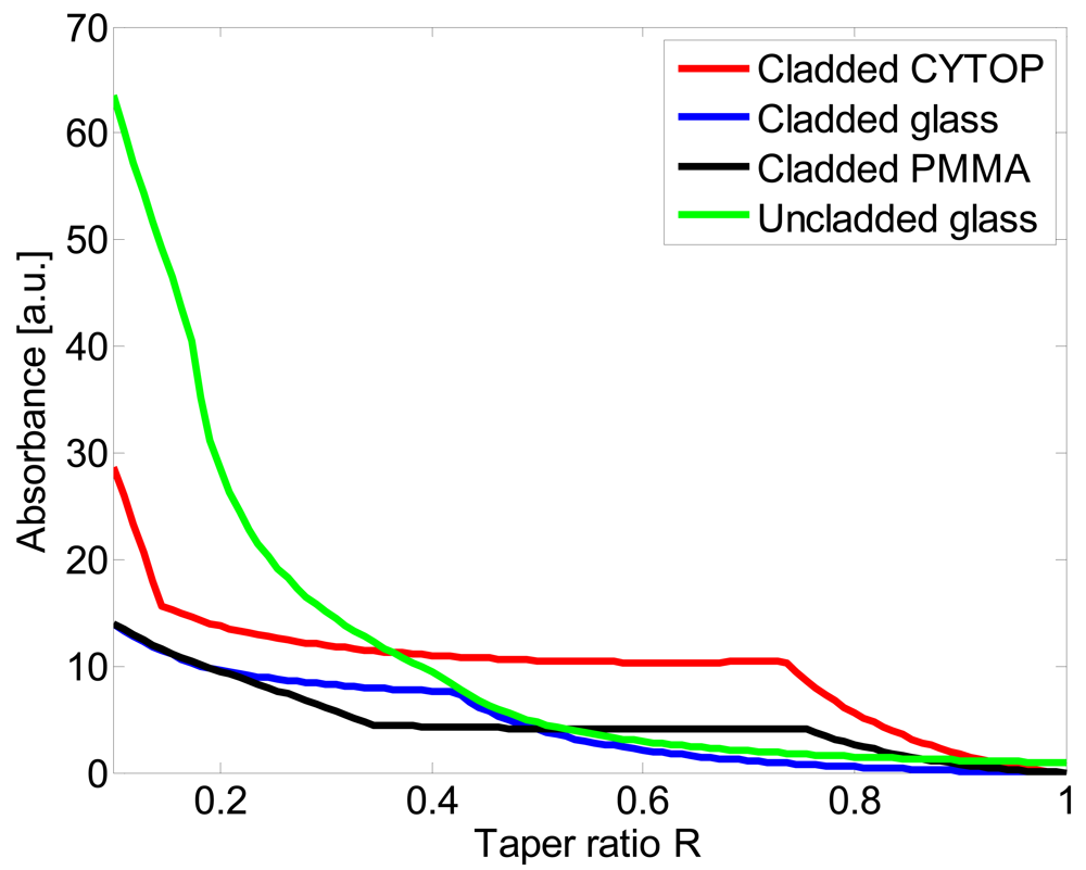 The taper sensitivity increases when tapering increases. Compared to cladded glass taper, the sensitivity of perfluorinated taper (CYTOP) increases faster, especially in the high R region; for example, cladded POF taper with R = 0.7 could be about 10 times more sensitive than the cladded glass one. Due to low refractive index of the core/cladding materials perfluorinated tapers also exhibit a higher sensitivity than cladded PMMA tapers. For comparison, the Figure also shows the absorbance of an uncladded glass fiber with the same fiber diameter. As can be observed for taper ratios higher than R ≈ 0.36 the sensitivity of perfluorinated POF tapers is greater than that of the uncladded glass one.