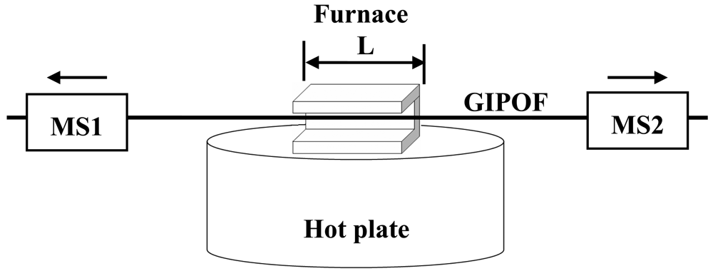 The fabrication process consists of two steps: in the first step, approximately 3.0 cm of the fiber was immersed for several minutes in chloroform for etching the polycarbonate overcladding; then the section without overcladding is heated in a furnace with a length L ≈ 1.9 cm and pulled at a fixed velocity using two motorized stages. The furnace is made of a U-shaped aluminum block fixed over a hot plate. This setup, shown in Figure 3, permits a simple insertion and extraction of fiber into the furnace and ensure a controlled extension of the fiber, allowing the prediction of the taper length and the waist dimension [5,12].