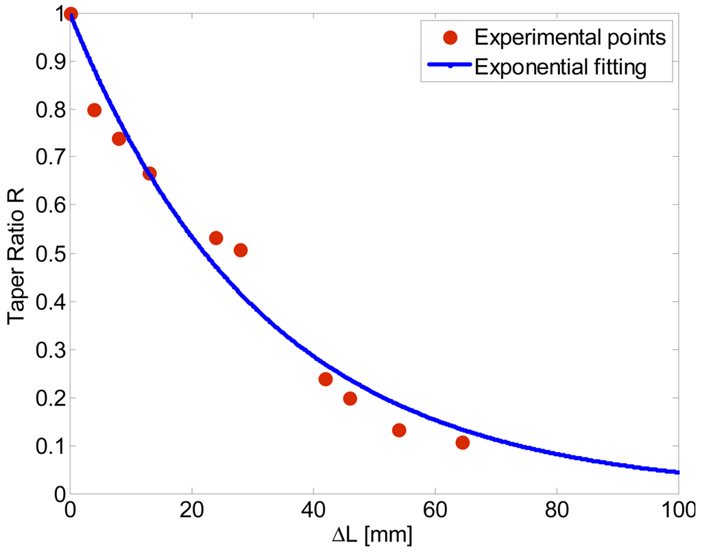 Several experiments have shown that the best results can be obtained with a furnace temperature of about 110 °C (the temperature glass transition of the material is Tg = 108), and setting the stage velocity at 50 μm/s. Devices with different taper ratios have been produced and the repeatability of the process has been verified. In Figure 4 the measured taper ratio R versus the total elongation ΔL is reported. The taper ratio R is predicted to vary with the elongation according to an exponential law [2,5,12]: