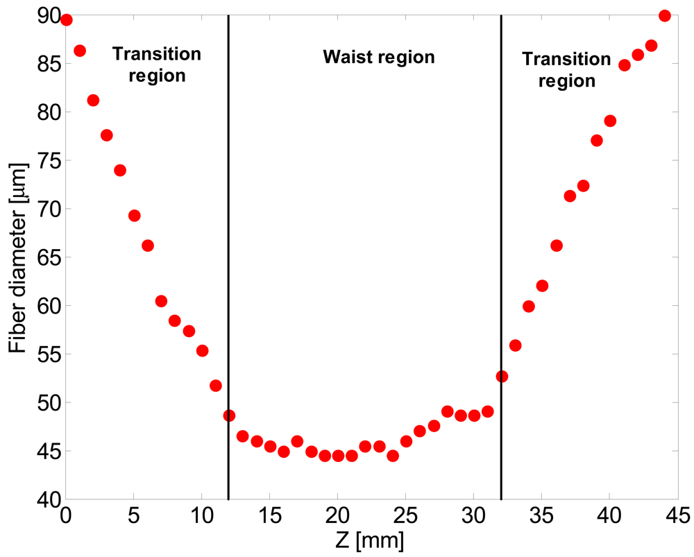 Fiber taper diameter measurements have been carried out by an optical microscope. The experimental result of the tapering process of a GIPOF62 (62.5 μm core and 90 μm cladding) for R = 0.5 setting the elongation distance at ΔL = 24 mm is shown in Figure 5, where a plot of fiber diameter vs. the position on the fiber axis (z axis) is reported. As shown, the taper has an exponential shaped transition, but the in waist region the diameter is not perfectly uniform. These results can be explained with a non-constant temperature along the furnace length as also reported in reference [5].