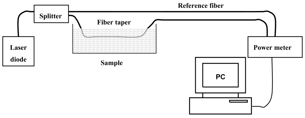 The experimental setup for evanescent wave absorption measurements is reported in Figure 6. Laser light from a fiber-coupled diode laser (λ = 650 nm, P = 2.5 mW, N.A. = 0.12) has been split using a 1 × 2 fiber splitter (2 m long, 200 μm core diameter, N.A. = 0.22).