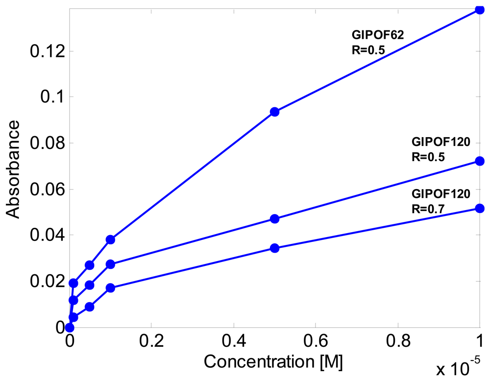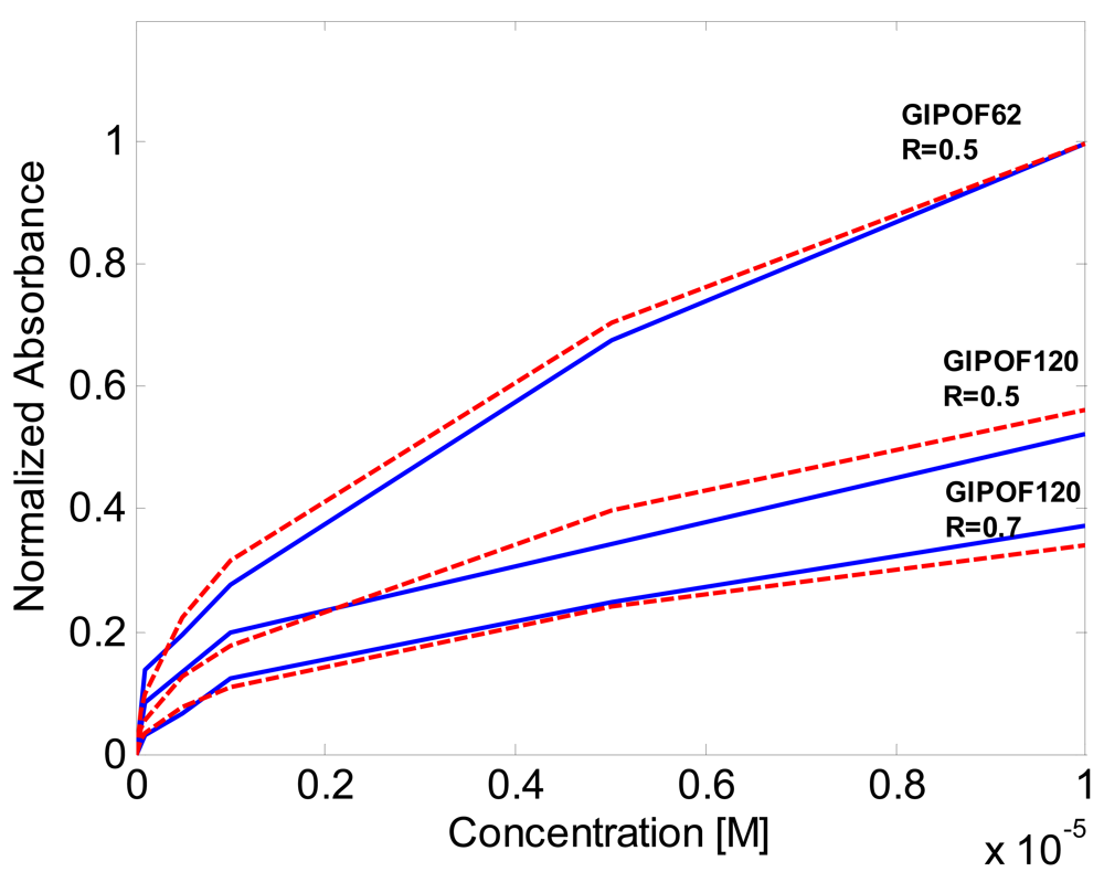 Absorbance measurements have been performed by immerging the taper region of GIPOF in a plastic sample chamber containing water with variable concentration of methylene blue in the 5 × 10−8 M to 1 × 10−5 M range.