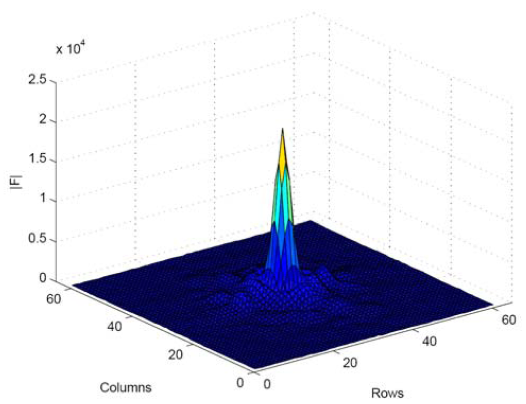 Figure 2 shows the shifted FFT of the image produced by the IRED in the camera. The image spectrum contains all the information about pixel distribution, which is equivalent to possessing the information about scene light conditions. Furthermore, a high percentage of the information concerning pixel distribution in the image of the IRED is contained around zero-frequency.
