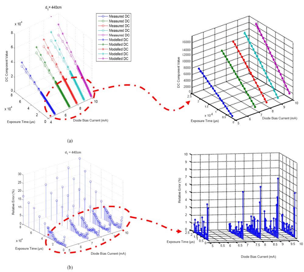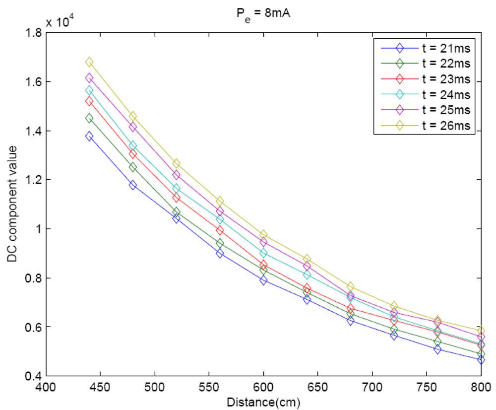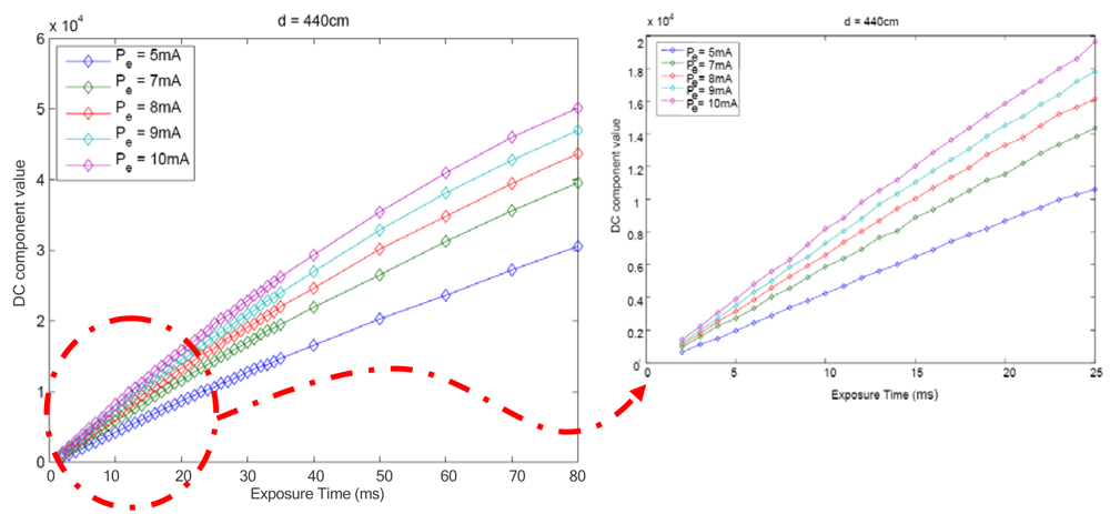 Figure 5 shows that the DC component decreases as the distance between the camera and the IRED increases. It could be modeled by: