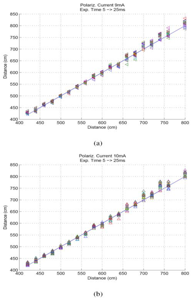 Figure 7, the distance estimation corresponding to 5, 6,…,25 ms, with 2 ms used as reference exposure time, is shown. The polarization currents used in these results are 9 and 10 mA respectively. For other polarization currents considered in the calibration process, similar results were obtained. In