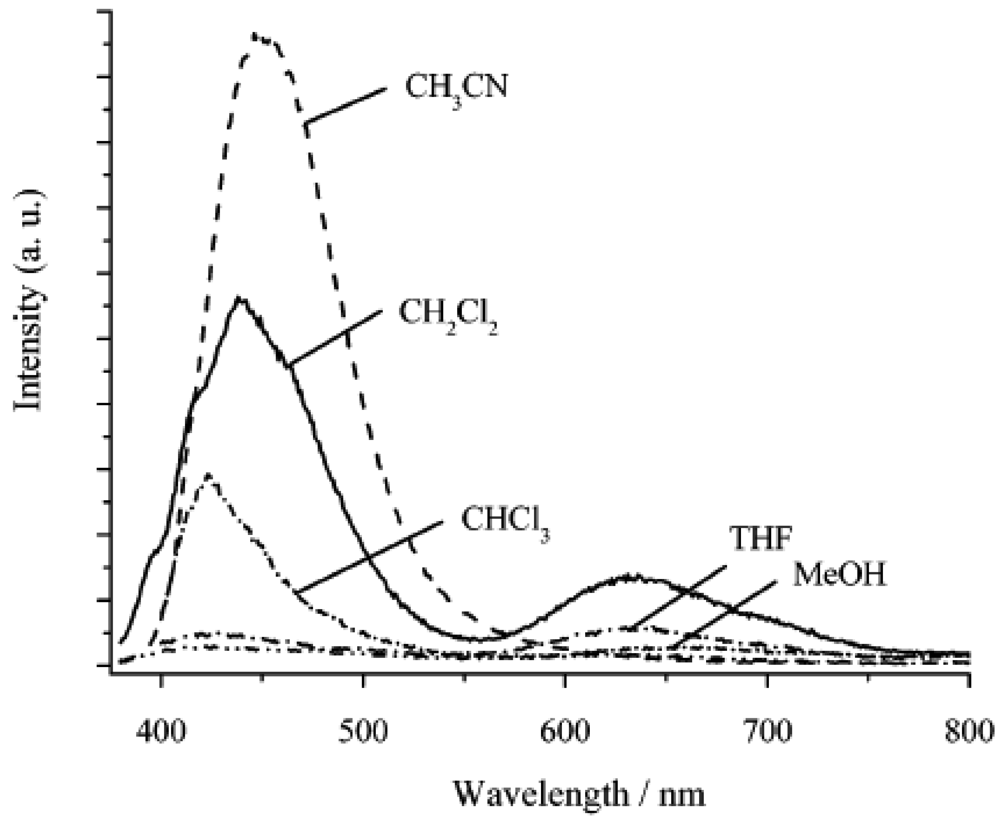 - Liu, Z.; Bian, Z.; Bian, J.; Li, Z.; Nie, D.; Huang, C. Acetonitrile-vapor-induced color and luminescence changes in a cyclometalated heteroleptic iridium complex. Inorg. Chem. 2008, 47, 8025–8030. [Google Scholar]