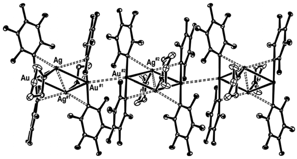 - Fernández, E.J.; Laguna, A.; Lopez-de-Luzuriaga, J.M.; Monge, M.; Montiel, M.; Olmos, M.E. Unsupported gold(I)-copper(I) interactions through η1 Au-[Au(C6F5)2]- coordination to Cu+ lewis acid sites. Inorg. Chem. 2005, 44, 1163–1165. [Google Scholar]