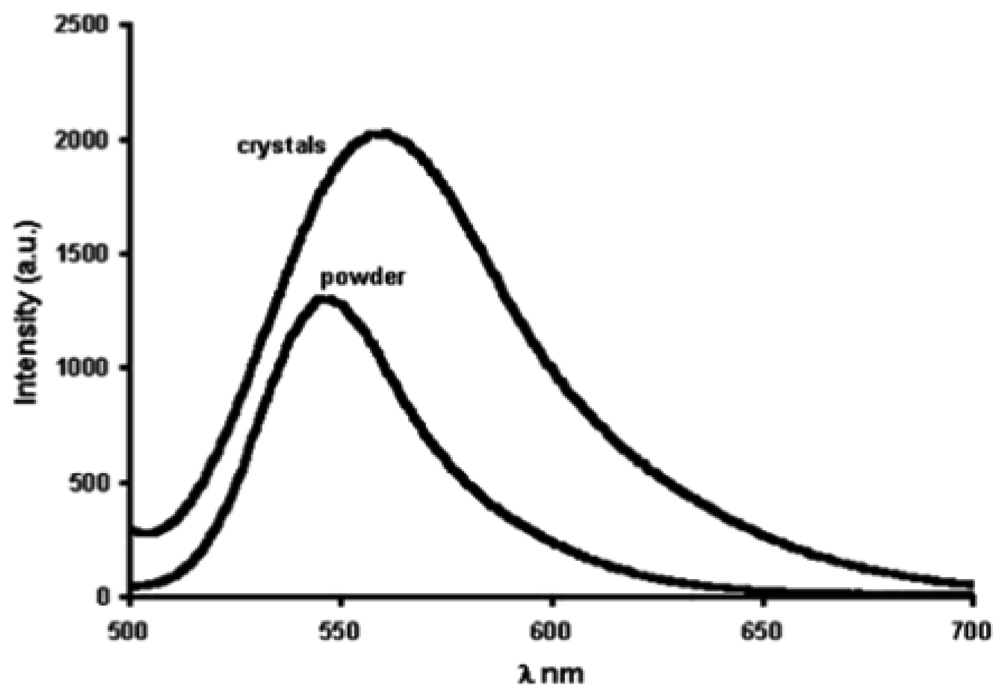 The last section of this review is devoted to literature reports of PL complexes that exhibit “vapochromism/vapoluminescence” behavior and are relevant to chemical sensing. Emphasis is placed on the solid state complexes, and the molecular interactions with volatile organic compounds (VOCs) that permit analyte recognition through observed changes in PL properties. This section reviews the numerous investigations that examine the photophysical properties of fluorophores that can potentially be employed as efficient chemosensors. Since the PL process has now become a routine spectroscopic technique, no effort is made in this review to describe the technical aspect of the methodology.