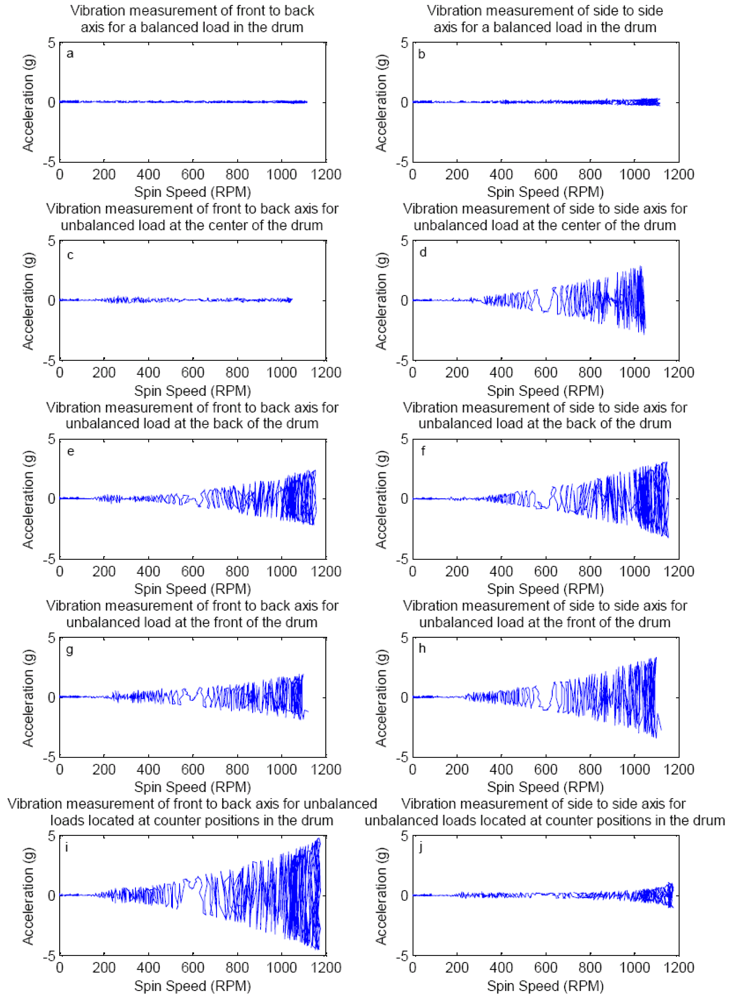 From Table 1 we see that some side-to-side vibration exists even when there is no unbalanced load in the drum, whereas there is no front-to-back vibration. The side-to-side vibration is attributed to the characteristics of the machine suspension system. Figure 2 shows continuous acceleration measurements during a speed sweep test from zero to over 1,000 rpm, with unbalance load of 0.5 kg, placed at various locations in the drum.