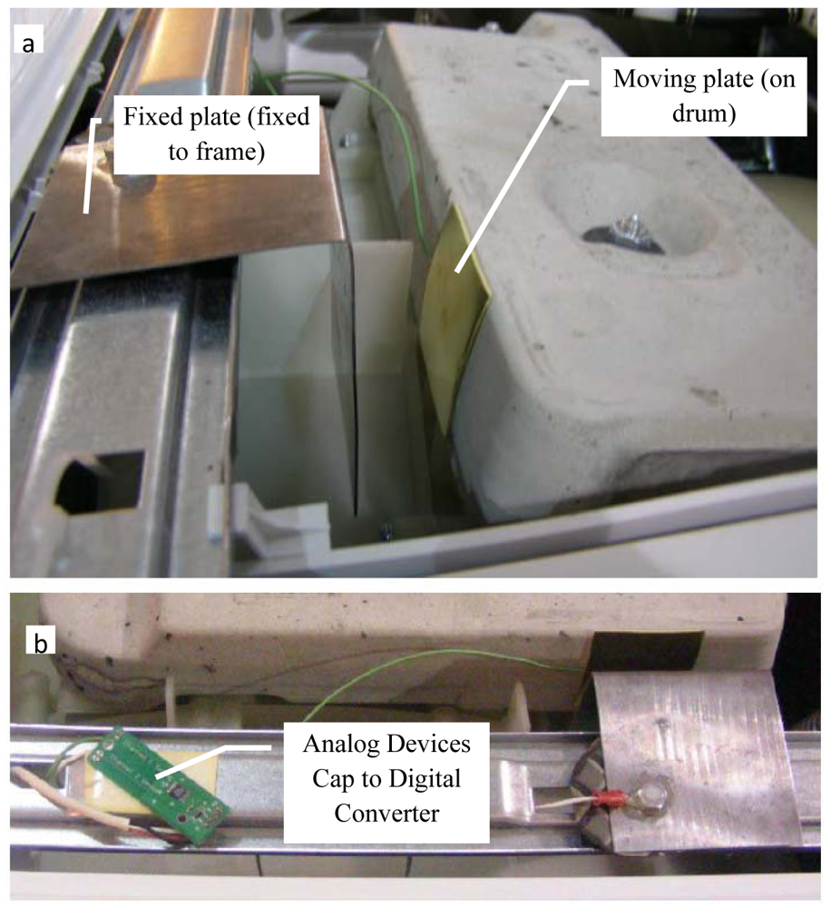 (a) Parallel plate configuration setup for displacement measurement on washing machine. (b) Capacitance to digital converter (Analog Devices, AD7746).