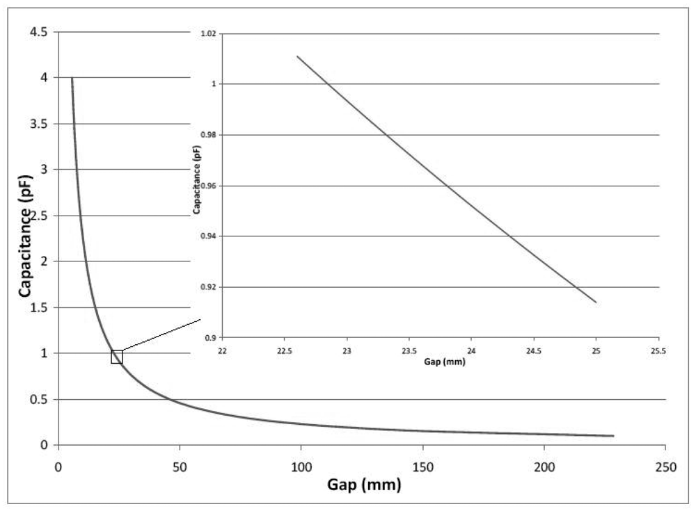 Figure 6 shows a plot of theoretical capacitance vs. distance between the plates, called the gap, for the setup used. The maximum displacement of the moving plate relative to the fixed electrode plate exceeds 20 mm when the machine is ramped up to 1,200 rpm, the full spin cycle speed, when there is an unbalance. We see that the gap to capacitance relationship is nearly linear and most sensitive for gaps below 20 mm but placing the plates at less than 20 mm away would result in the plates coming in contact during the operation of the machine. Hence, it was decided to place the electrodes as far apart as possible in this nearly linear region, i.e., at 23.5 mm since the maximum range of motion during the low speed detection phase is ±1.5 mm from the mean gap. The capacitance versus gap for this range of motion is shown in the inset in Figure 6, and the behavior is well approximated to be linear.