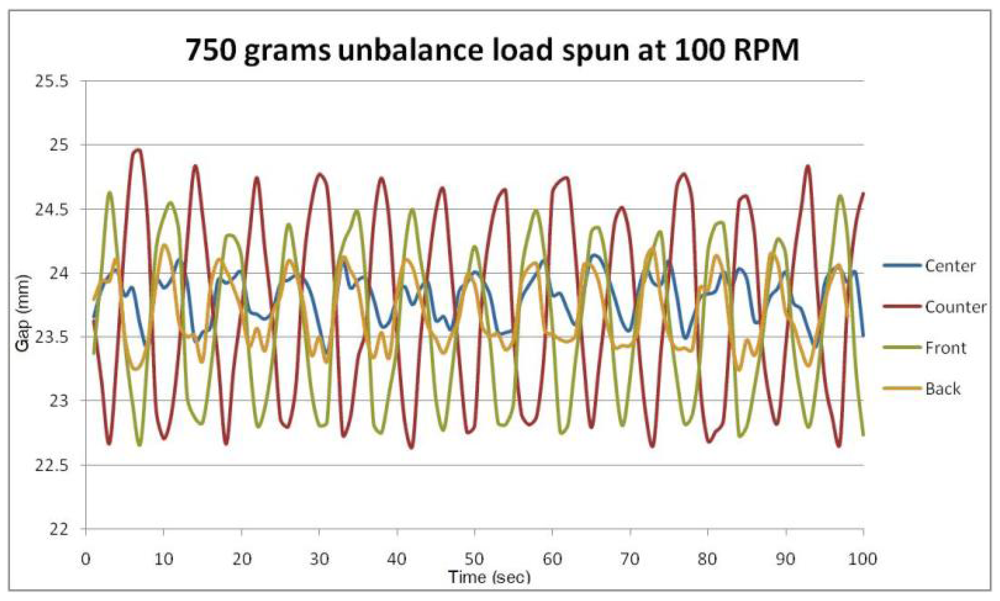From the results of test shown in Figure 2 it is observed that the resonance occurs around 250 rpm (ref. Figure 2e, for example), as indicated by a local peak in the front-to-back acceleration measurement, which is not detected in the side-to-side axis (ref. Figure 2f, for example). We also see that unbalance detection using the accelerometer starts near 200 rpm and front-to-back axis measurement is more sensitive at lower rpm. We also see that front-to-back acceleration measurement works better for detection in case of unbalanced loads in counter positions which was observed to be the worst case. Our objective is to detect unbalances, if present, at or below 100 rpm which gives a reasonable amount of time (about 3-4 seconds if the drum is ramping at 40 rpm/sec) before the drum reaches a resonant frequency to take any corrective action necessary and ensure that we do not spin an unbalanced drum through resonance. This is not possible with standard commercial accelerometers, as seen in the initial results shown in Figure 2. Thus it may be necessary to use a more sensitive method of detection of vibration at low speeds to detect unbalance. Further, it can be observed that the vibration measurement along the front to back axis is more sensitive to detect unbalance than side to side movement for any of the unbalance cases studied.