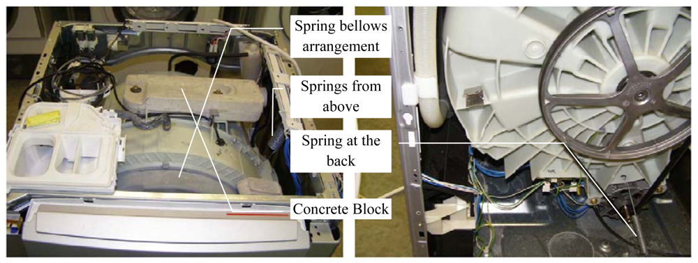 - Türkay, O.S.; Sümer, İ.T.; Tušcu, A.K.; Kiray, B. Modeling and Experimental Assessment of Suspension Dynamics of a Horizontal-Axis Washing Machine. J. Vib. Acoust. (Trans. ASME) 1998, 120, 534–543. [Google Scholar]