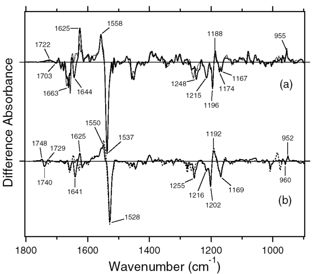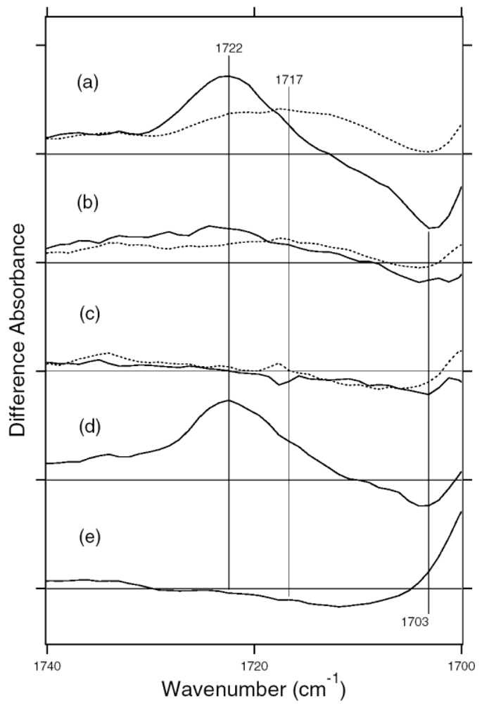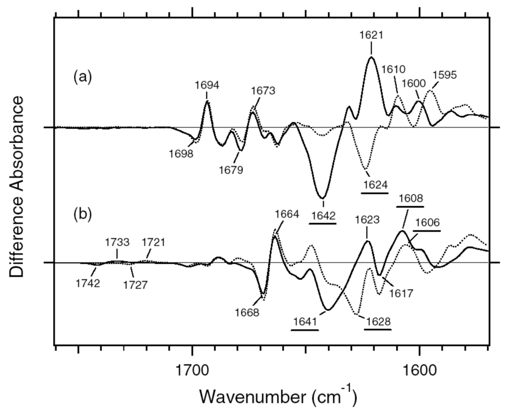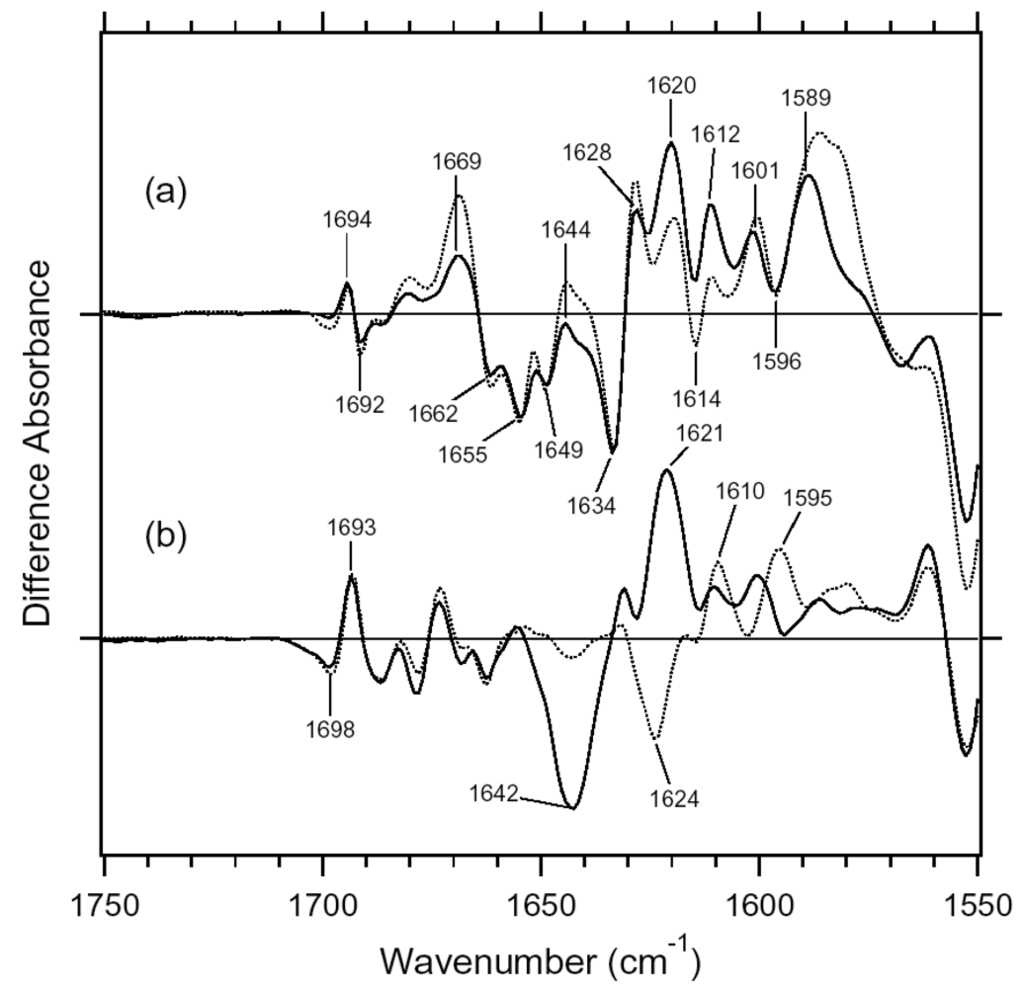 The 13C-ASRK minus 13C-ASR (a) and the AT-ASRK minus AT-ASR (b) spectra (pH 7) in the 1,750–1,550 cm-1 region, mostly representing vibrations of the protein moiety. The sample was hydrated with H2O (solid lines) or D2O (dotted lines). One division of the y-axis corresponds to 0.0025 absorbance units. This figure is reprinted with permission from Kawanabe et al. [59]. Copyright 2006 American Chemical Society.