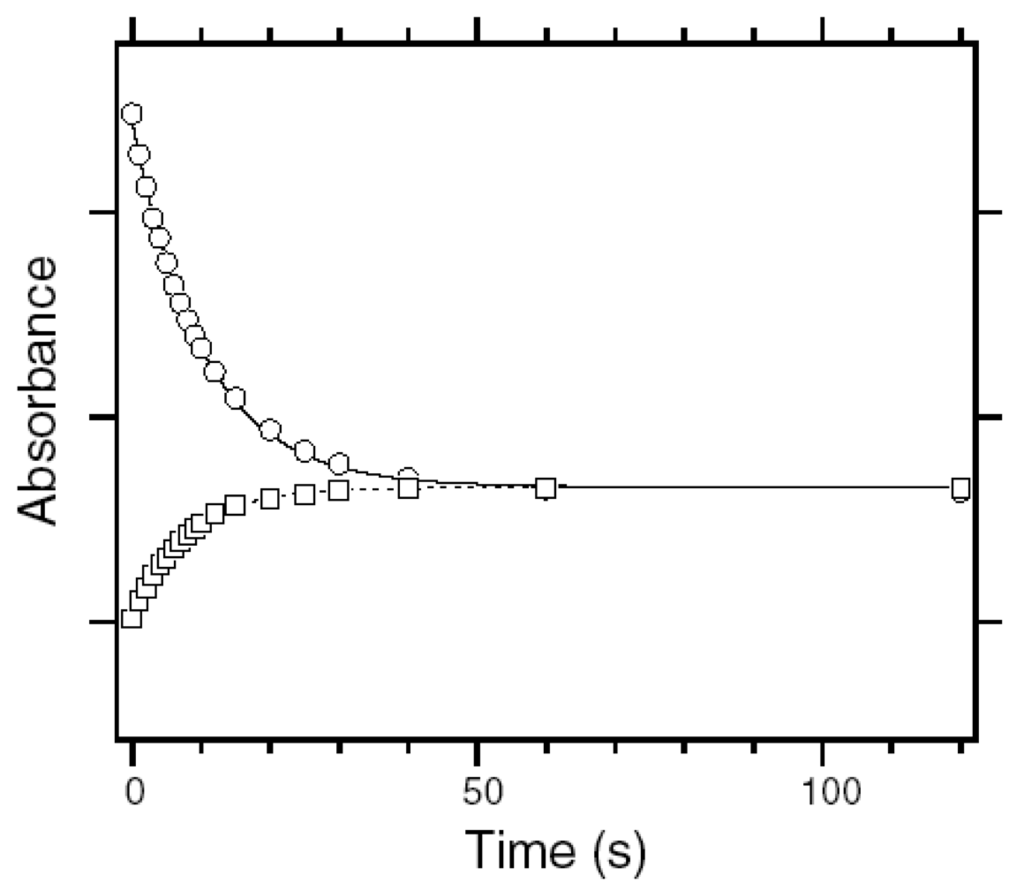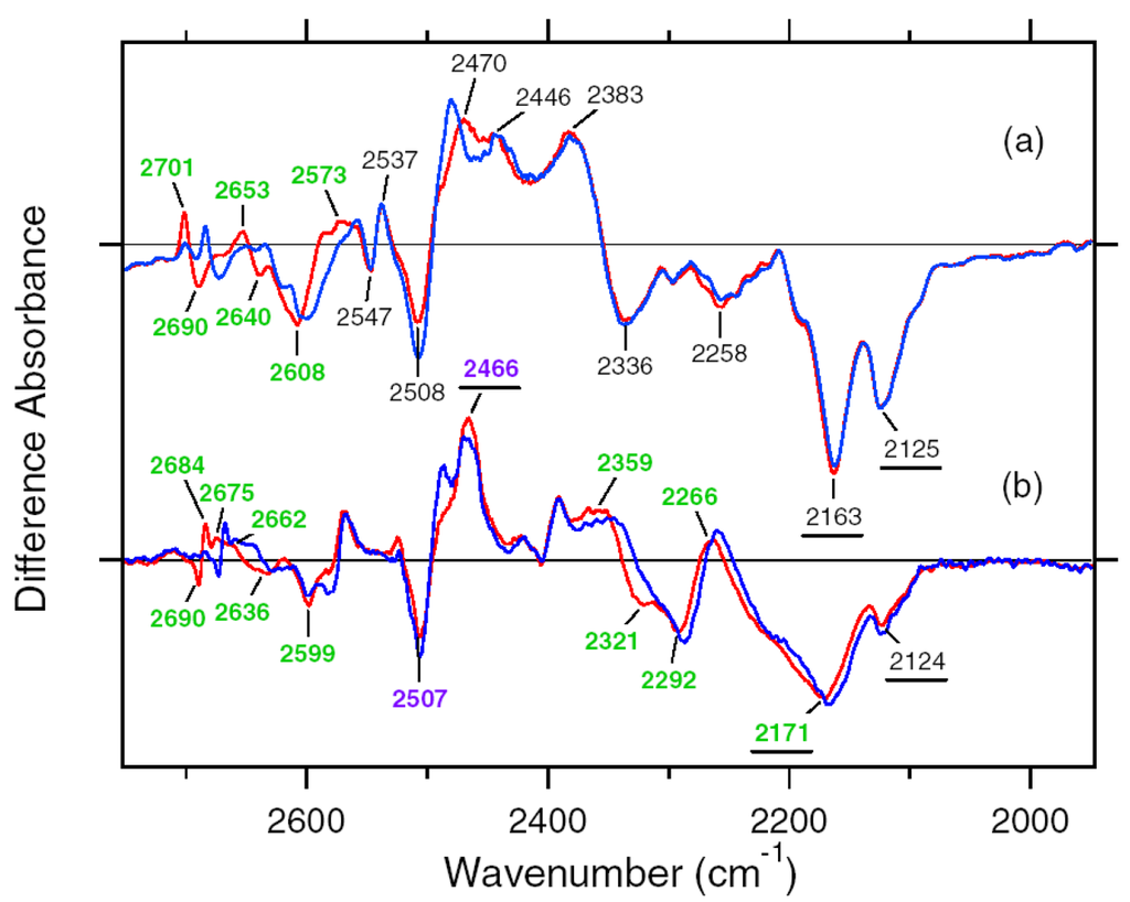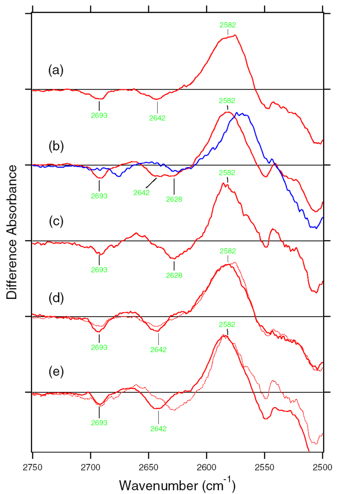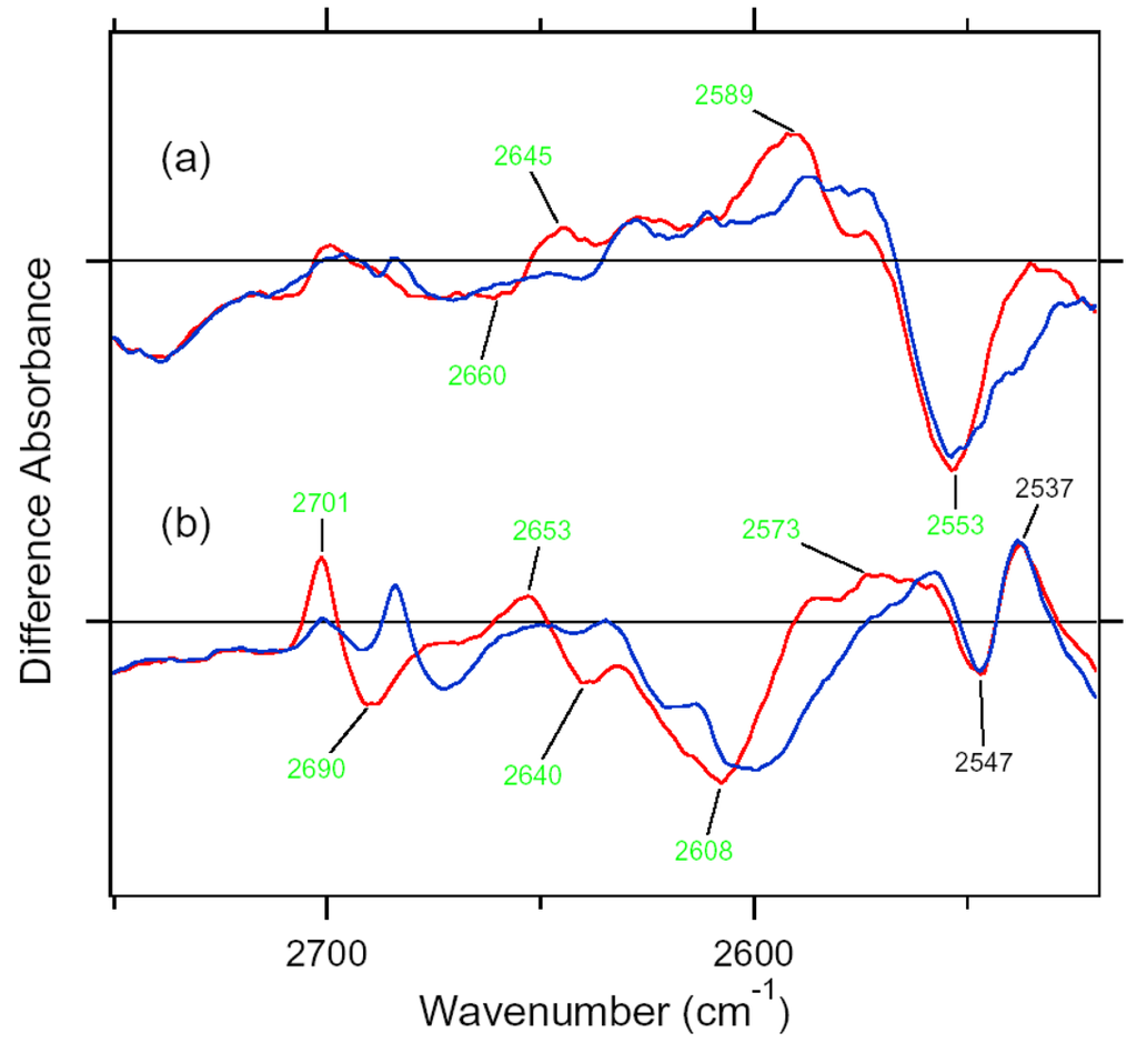 Figure 12 shows the ASRK minus ASR spectra in the 2,590–2,500 cm-1 (top panel) and 1,890–1,800 cm-1 (bottom panel) regions, which correspond to S-H and S-D stretching vibrations of cysteine residues, respectively. There are a negative band at 2,547 cm-1 and a positive band at 2,538 cm-1, while no band is observed in the S-D stretching upon hydration with D2O.