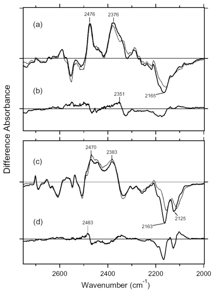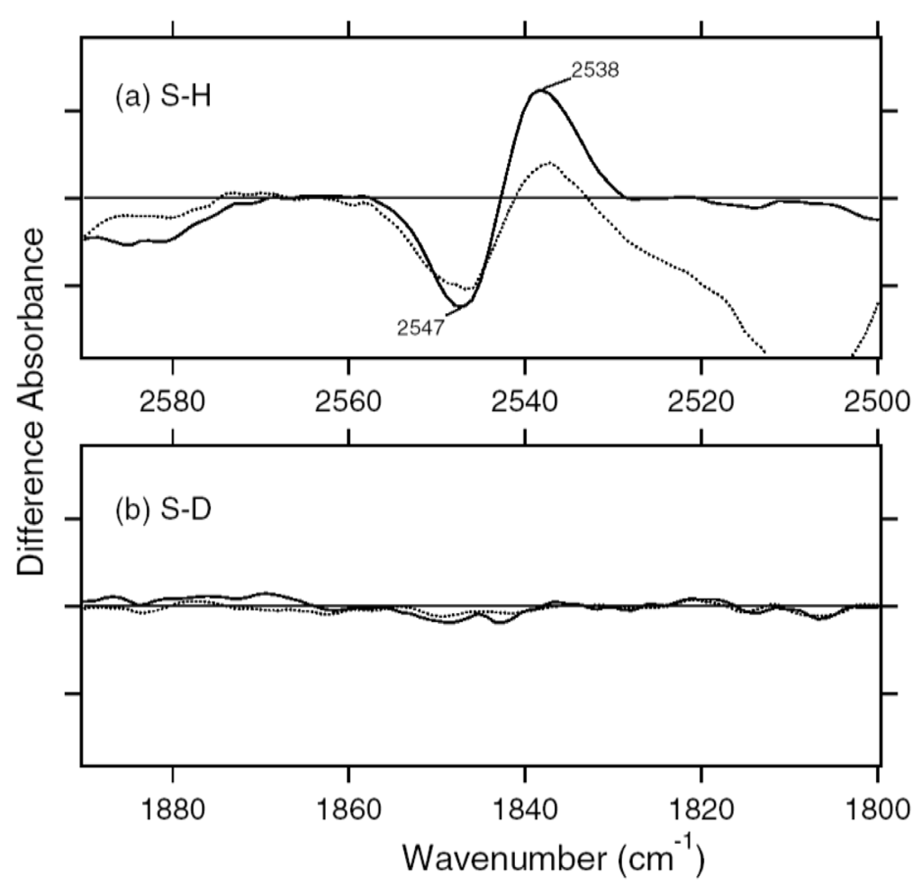 The ASRK minus ASR spectra in the 2,590–2,500 cm-1 (the upper panel) and 1,890-1,800 cm-1 (the lower panel) region, which correspond to S-H and S-D stretching vibrations of cysteine residues, respectively. The sample was hydrated with H2O (solid lines) or D2O (dotted lines). One division of the y-axis corresponds to 0.0001 absorbance units. This figure is reprinted with permission from Furutani et al. [20]. Copyright 2005 American Chemical Society.