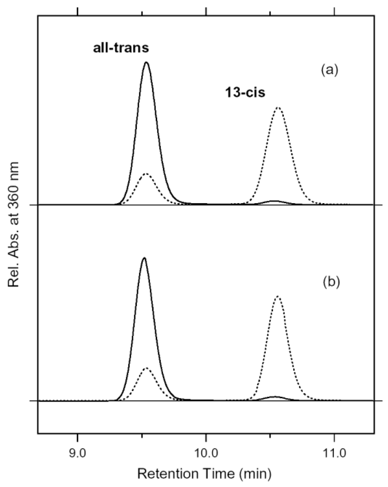 Dark-adapted ASR is predominantly in the all-trans form, while the light adaptation process increases concentration of the 13-cis form [16,57]. This is in contrast to the case of BR, where light adaptation leads to a complete conversion into the all-trans form [58]. In this study, we attempted to establish the illumination conditions to accumulate the 13-cis form for DM-solubilized and PC-liposome-based ASR samples, using HPLC column chromatography. Panels a and b of Figure 14 show that the dark-adapted ASR (solid lines) possesses 95.5% and 97.1% all-trans form for the DM-solubilized and PC-liposome-based samples, respectively. On the other hand, illumination of ASR with >560 nm light for 1 min at 4 °C results in accumulation of 13C-ASR. HPLC analysis showed that the light-adapted ASR possesses 78.1% and 77.9% of the 13-cis form for the DM-solubilized and PC-liposome-based samples, respectively. Thus, the isomeric composition was not influenced by the reconstitution. Dark adaptation was a slow process, with half-time >1 h at 4 °C (data not shown). It should be noted that Sineshchekov et al. estimated the ratio of all-trans and 13-cis form to be 67:33 in the dark-adapted ASR and 20:80 in the light-adapted ASR [57]. The different value in the dark-adapted state may originate from the lipids for reconstitution (E.coli membrane in [57]).