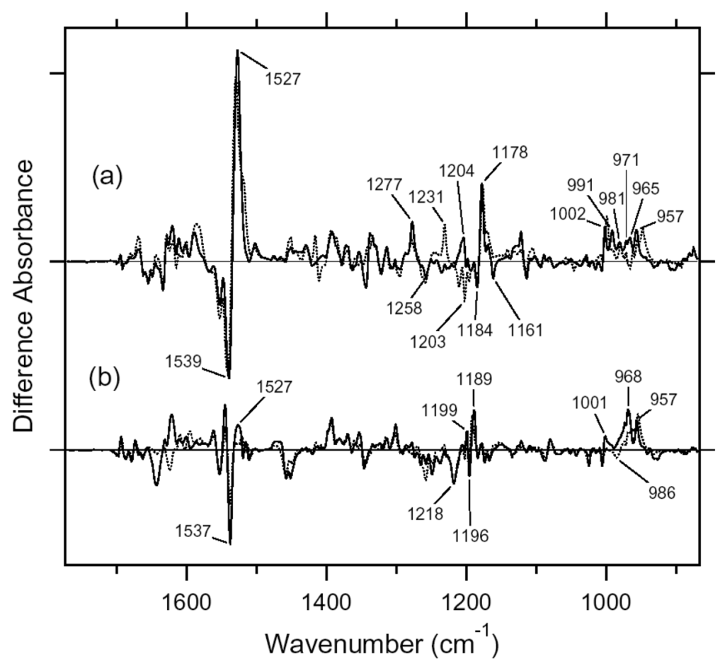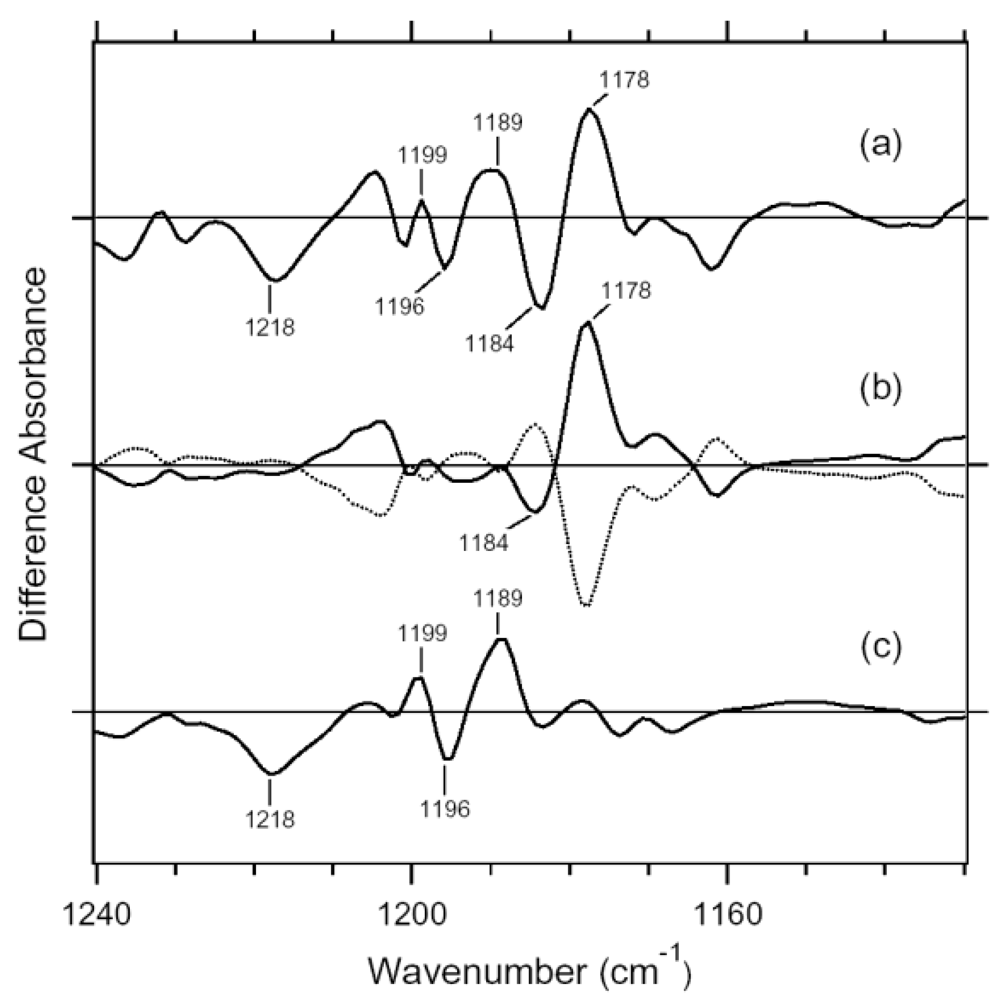 A hydrated film of ASR in PC liposomes was light-adapted as described above and then cooled to 77 K, followed by illumination at 501 nm. Figure 15a shows the light minus dark difference FTIR spectra of the light-adapted ASR. Vibrational bands at 1,218(−), 1,199(+), 1,196(−), and 1,189(+) cm-1 also appear in the AT-ASRK minus AT-ASR (Figure 15c) [20], indicating that the conversion of AT-ASR to AT-ASRK is included in the spectrum of Figure 15a. On the other hand, Figure 15a possesses additional strong peaks at 1,184 (−) and 1,178 (+) cm-1, suggesting the involvement of the photoreaction of 13C-ASR. In the previous study for AT-ASR, we illuminated AT-ASRK at >590 nm for the photoreversion to AT-ASR [20]. In the present study, subsequent illuminations at >560 and 501 nm yielded the spectra shown in Figure 15b (dotted and solid lines, respectively). Lack of the bands at 1,218, 1,199, 1,196, and 1,189 cm-1 strongly suggests that the spectra should not contain the photoreaction of AT-ASR. In other words, the solid line in Figure 15b corresponds to the 13C-ASRK minus 13C-ASR spectrum. In fact, the spectrum of Figure 15a is well constructed from the solid lines in Figure 15b,c (data not shown). In this way, we obtained the 13C-ASRK minus 13C-ASR difference FTIR spectra without any subtraction of spectral contribution from AT-ASR.