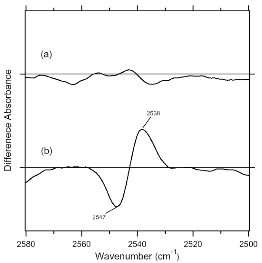 Figure 18 shows the 13C-ASRK minus 13C-ASR (upper panel) and AT-ASRK minus AT-ASR (lower panel) spectra in the 2,580–2,500 cm-1 region, which corresponds to S-H stretching vibration of cysteine. As we already reported, there is a negative band at 2,547 cm-1 and a positive band at 2,538 cm-1 for AT-ASR (Figure 18b). In contrast, no spectral changes were observed for 13C-ASR, indicating that the 13-cis to all-trans isomerization in ASR does not alter the local structure of cysteines (Figure 18a). We suggested that the observed vibrational bands may be assignable to the S-H stretching of Cys203 in previous section [20].