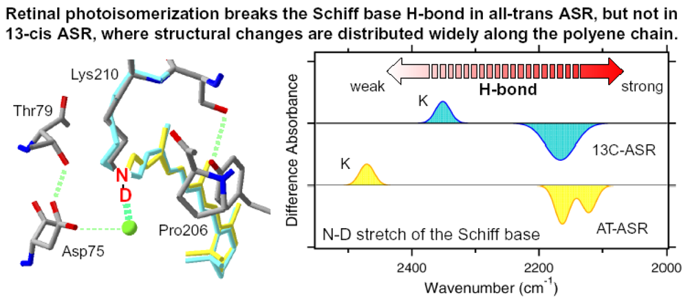 We then extended the low-temperature spectroscopic study at 77 K to the 13-cis, 15-syn form of ASR (13C-ASR). HPLC analysis revealed that light-adapted ASR with >560 nm light at 4 °C possesses 78% 13C-ASR, while dark-adapted ASR has AT-ASR predominantly (97%). Then, we established the illumination conditions to measure the difference spectra between 13C-ASR and its K state without subtracting the difference between AT-ASR and its K state. Spectral comparison between 13C-ASR and AT-ASR provided useful information on structure and structural changes upon retinal photoisomerization in ASR. In particular, previous X-ray crystallographic study of ASR reported the same protein structure for 13C-ASR and AT-ASR [16], whereas the present FTIR study revealed that protein structural changes upon retinal photoisomerization were significantly different between 13C-ASR and AT-ASR. The differences were seen for HOOP modes of the retinal chromophore, amide I, cysteine S-H stretch, the Schiff base N-D stretch, and water O-D stretch modes. These must trigger different global protein structural changes in each photoreaction cycle leading to the observed photochromic behavior.