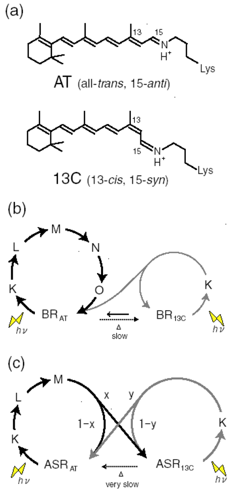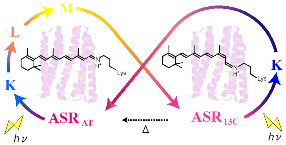 According to the X-ray crystal structure of ASR (Figure 4), it is similar to those of other archaeal-type rhodopsins. ASR accommodates both all-trans and 13-cis retinal in the ground state, which can be interconverted by illumination with blue (480 nm) or orange (590 nm) light (Figure 3) [16]. Such photochromic behavior has never been observed in other archaeal rhodopsins such as BR, HR, SRI and SRII, being characteristic to ASR. These results suggested that ASR could be a photochromic color sensor, whereas nothing was well-known about the structural changes and scheme of its photochromic reactions when we started the study.